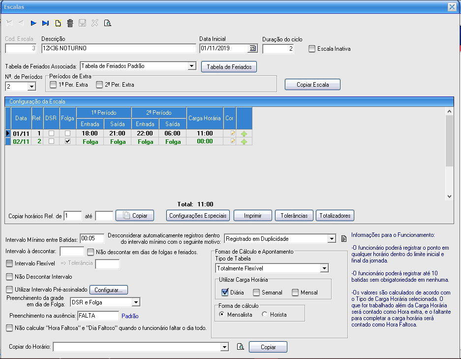 22 – Marcando a opção ‘Intervalo Flexível’, o sistema habilita o campo Tolerância. Informe neste campo o tempo estimado para a tolerância da escala.