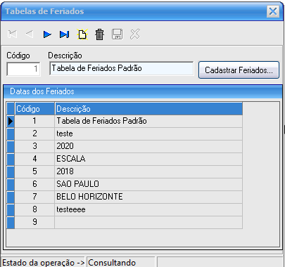 Na tela a seguir o usuário poderá cadastrar tabelas de feriados.