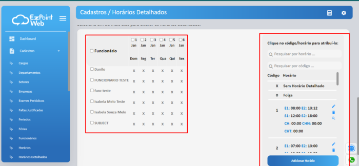 - Para incluir um horário – Para inserir um horário detalhado faça o mesmo processo, clicando no dia que corresponde ao funcionário e então clique no número correspondente ao horário na legenda ao lado.