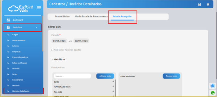 - Acesse o Menu e clique em Cadastros, em seguida clique em Horários Detalhados. Na tela que abrir, clique na coluna Modo Avançado e busque o período inicial e final que precisar. Clique em Filtrar.