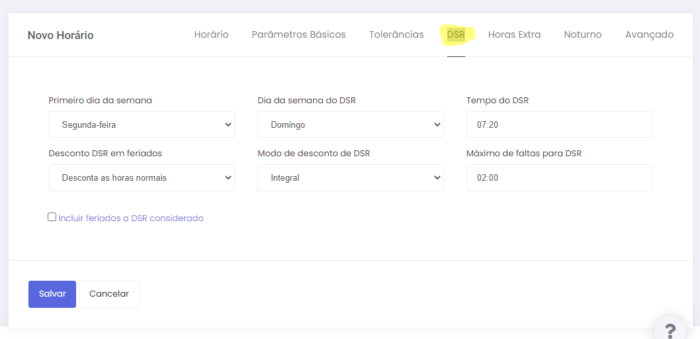 - Tempo do DSR – Nessa opção definimos quanto tempo do dia é considerado Descanso Semanal Remunerado