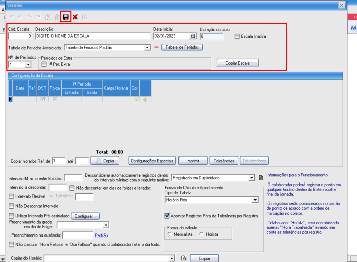 - Primeiramente, preencha o cabeçalho do horário, inserindo em Descrição o nome da escala, em Data Inicial o dia em que a escala começa, em Duração do Ciclo os dias em que vamos incluir os horários da escala para que seja repetido depois (Exemplo: na escala 18×36 até que preenchemos todos os horários que o funcionário fará, totalizarão 8 dias), em Nº de Períodos preencher a quantidade de períodos (Exemplo: caso o funcionário pare para fazer intervalo, seu horário possui 2 períodos, e caso pare para fazer dois intervalos, seu horário possui 3 períodos e assim por diante). Após preencher essas inforações, clique no ícone do disquete para salvar.