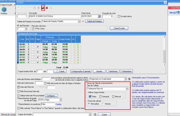 - Por último, preencha as configurações da escala, deixando como padrão da seguinte forma: em Tipos de Tabela como Totalmente flexível, em Utilizar carga horária como Diária e em Forma de Cálculo como Mensalista