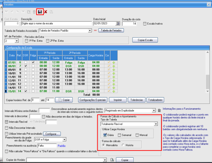 - Por último, preencha as configurações da escala, deixando como padrão da seguinte forma: em Tipos de Tabela como Totalmente flexível, em Utilizar carga horária como Diária e em Forma de Cálculo como Mensalista