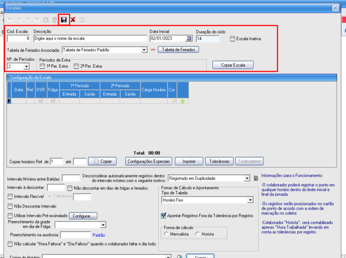 - Primeiramente, preencha o cabeçalho do horário, inserindo em Descrição o nome da escala, em Data Inicial o dia em que a escala começa, em Duração do Ciclo os dias em que vamos incluir os horários da escala para que seja repetido depois (Exemplo: numa escala que tem revezamento semanal, precisamos criar uma tabela que indique os horários da primeira semana e os horários da segunda semana, totalizando 14 dias), em Nº de Períodos preencher a quantidade de períodos (Exemplo: caso o funcionário pare para fazer intervalo, seu horário possui 2 períodos, e caso pare para fazer dois intervalos, seu horário possui 3 períodos e assim por diante). Após preencher essas inforações, clique no ícone do disquete para salvar.