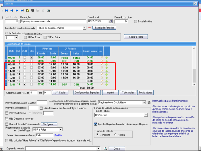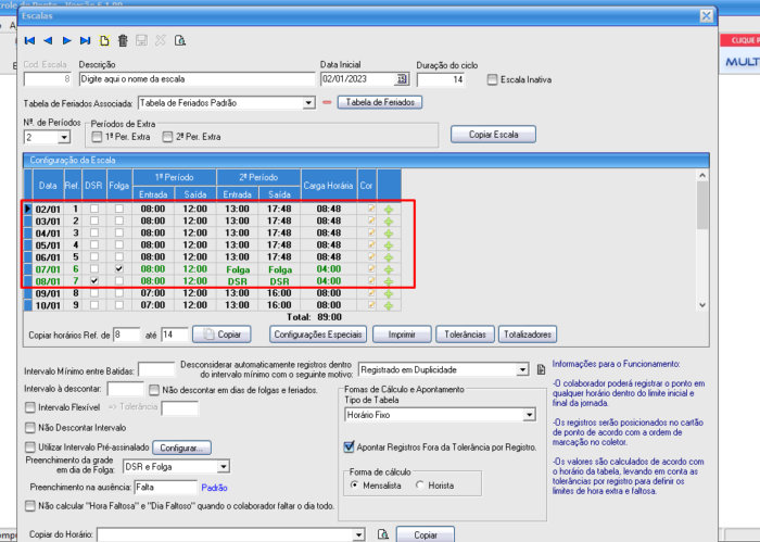 Na próxima semana, começando na segunda feira do dia 9 de janeiro, o funcionário começa a trabalhar em outro horário e tambem trabalhará no sábado, então preenchemos todos os dias e marcamos somente o Domingo como DSR