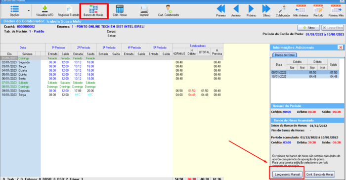 - Busque o funcionário e clique em Banco de Horas no menu superior e em seguida, na aba lateral que abrir clique em Lançamento Manual
