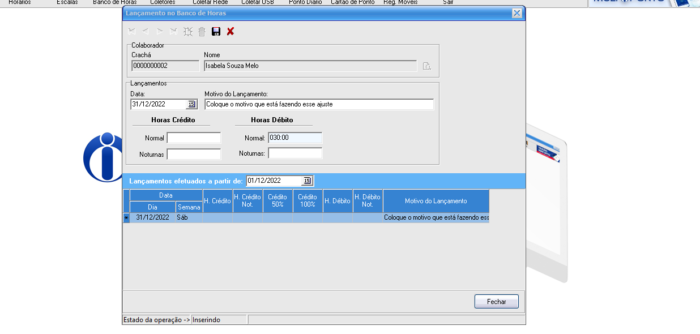 (No caso do exemplo abaixo, o funcionário receberá 30:00 horas negativas no banco de horas no dia 31/12/2022)