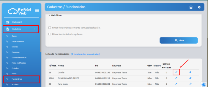 - Nessa mesma tela mais abaixo, aparecerá a lista de funcionários. Clique no ícone de um lápis para editar o cadastro do funcionário em questão.
