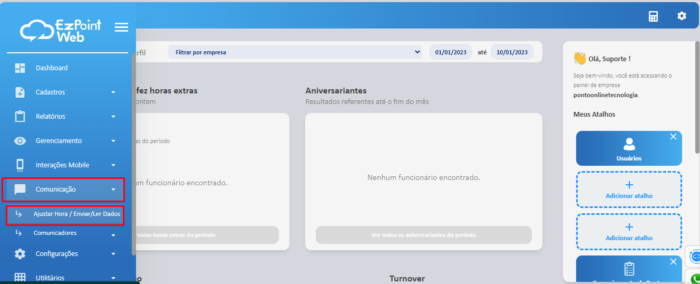 Para que os registros de ponto subam para o sistema de pontos é necessário realizar a leitura de dados, ou seja, a transferência dos registros de ponto do relógio de ponto para o EzpointWeb. Para realizar o processo, faça o seguinte: