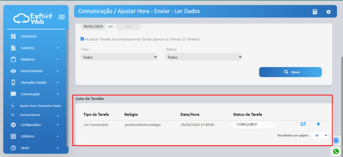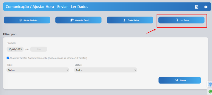 - Ao abrir a página, será exibido o status das tarefas de leituras feitas anteriormente caso for necessário consultar, e para realizar uma nova leitura de registro de pontos, clique em Ler Dados