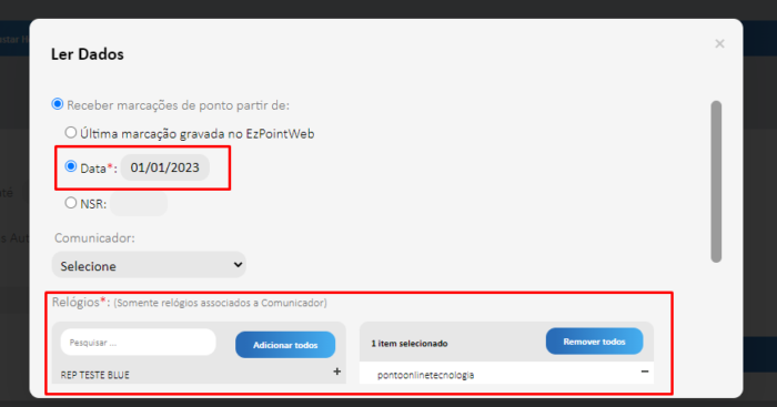 - Selecione o campo Data e insira uma data em que vai ser feita a leitura dos registros de ponto, e todas as marcações feitas desse dia em diante serão transferidas para o sistema com prioridade. Selecione tambem o relógio de ponto e clique em Ler