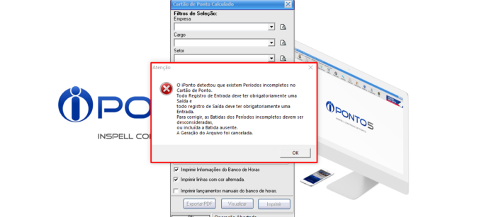 Pode acontecer de no momento em você clica para gerar o relatório do Cartão de Pontos é exibido uma mensagem que impede que o relatório seja visualizado ou imprimido. Isso acontece por motivos de segurança, em que você só pode gerar o relatório quando todos os funcionários escolhidos estiverem com todos os pontos tratados, ou seja, sem dias com registros de pontos faltando.