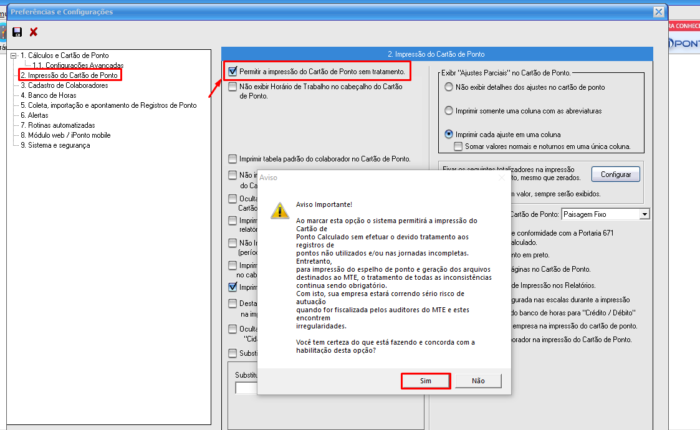- Clique em Impressão do Cartão de Pontos e então marque a primeira opção Permitir impressão do Cartão de Ponto sem tratamento. Na tela de mensagem de confirmação, clique em Sim