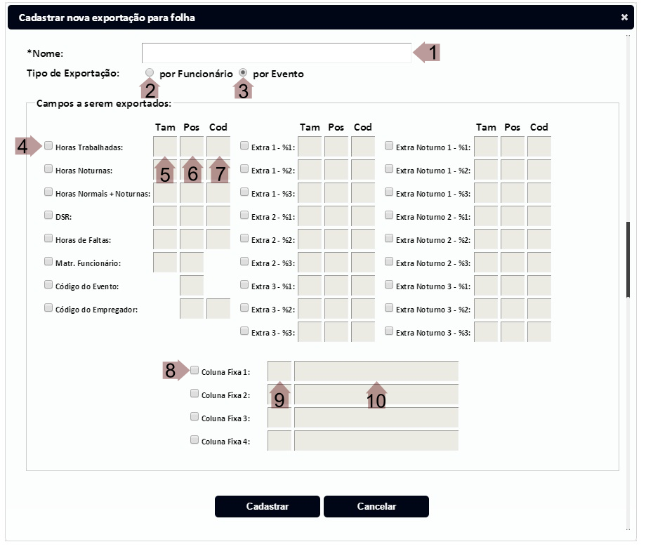 - Campo para preenchimento do código do evento de cada campo. Este código é utilizado somente quando o tipo de exportação for “por Evento” (campo “3”).