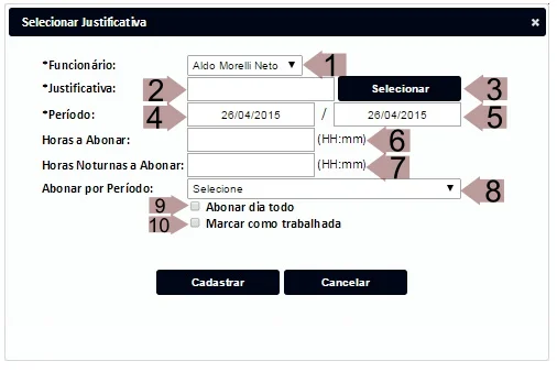 6.4. Botão para confirmar o motivo preenchido. - Campo que exibe a quantidade de horas (ou período) abonadas(o) no dia.