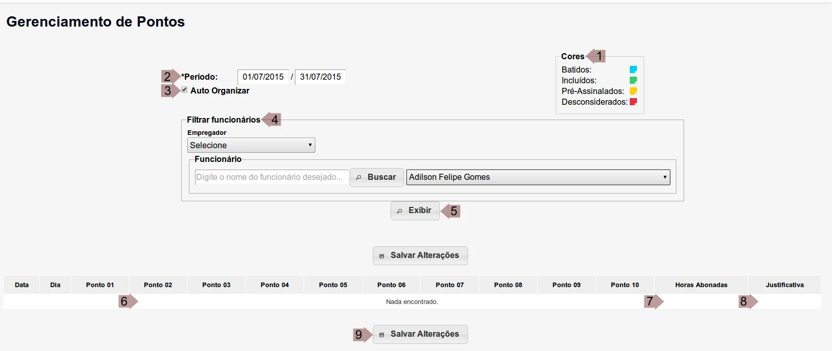8.2. Botão para alterar o motivo do ponto clicado. - Botão para salvar as alterações realizadas (pontos inseridos/desconsiderados, alterações de motivos, cadastro de faltas justificadas).
