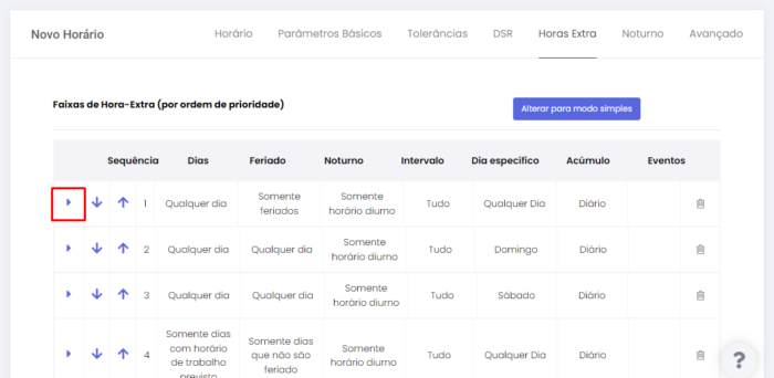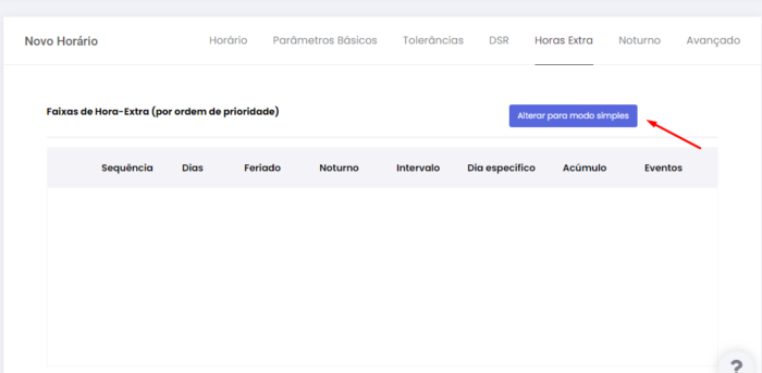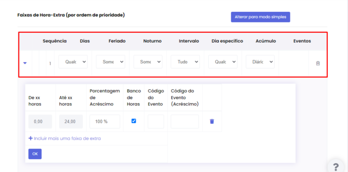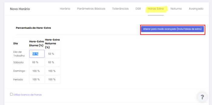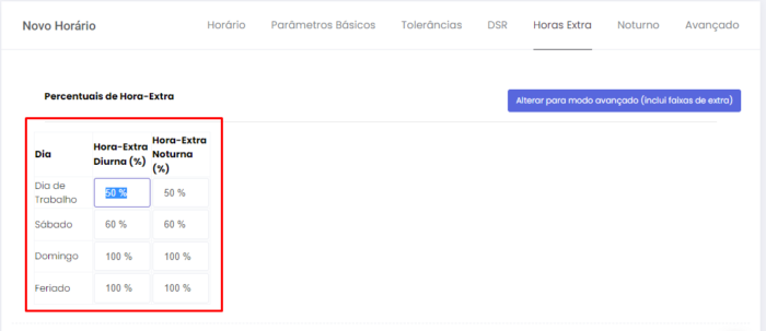 - Para o caso de configurações mais detalhadas de horas extras, como horas extras excedentes por exemplo, clique no botão Alternar para modo avançado (inclui faixas de extras)