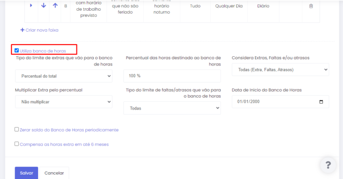 - Data de Inicio do Banco de Horas – aqui é preciso definir a partir de qual data o banco de horas começa a ser contabilizado.