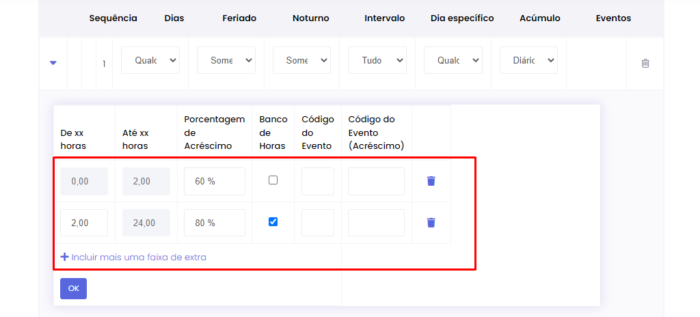 - Para configurarmos horas excedentes por exemplo, podemos clicar em incluir mais uma faixa de extra para definir de que horas até quantas horas será considerado horas excedentes e definir uma porcentagem diferente para elas.