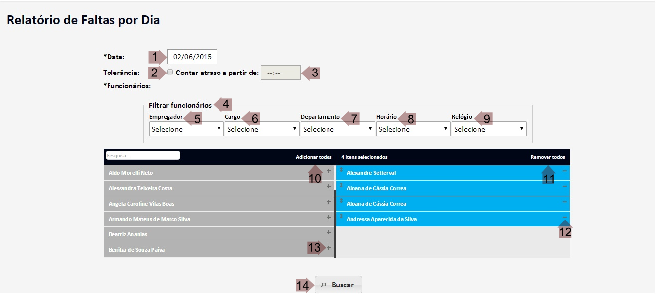 - Campos para filtrar a listagem de funcionários a serem selecionados.